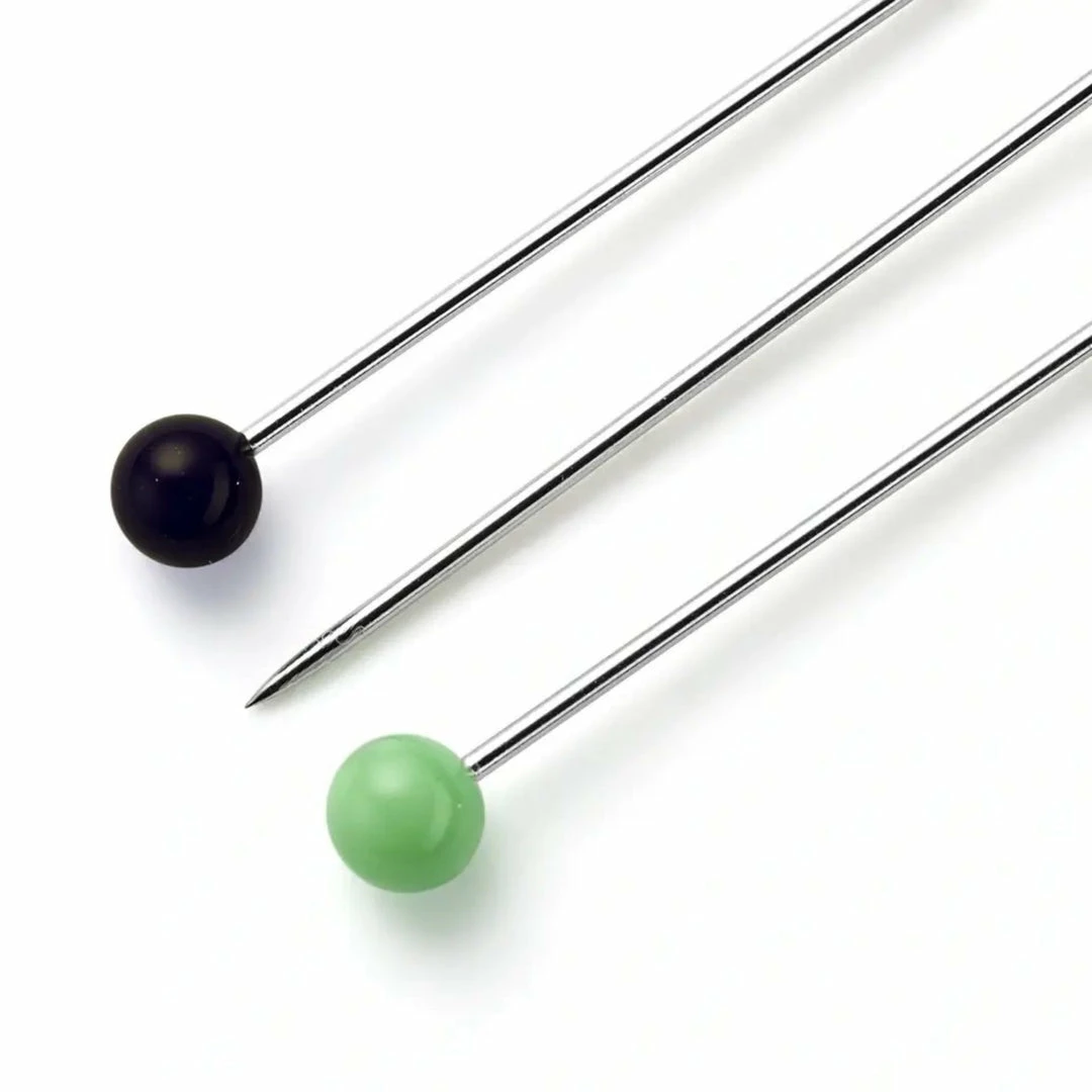 These glass head pins have heat-resistant, round heads made of high-quality glass. The glass heads come in assorted colors, that can be easily be seen on a variety of fabrics. The smooth shaft of the pins is made from hardened steel. The sharp tip penetrates easily through all fabrics.