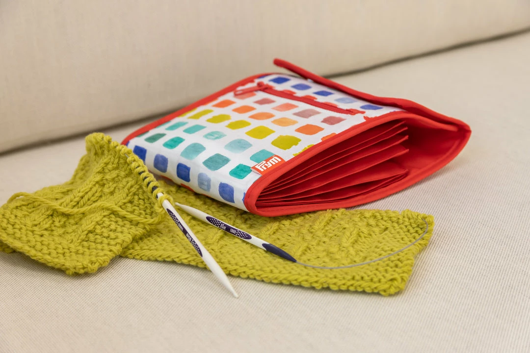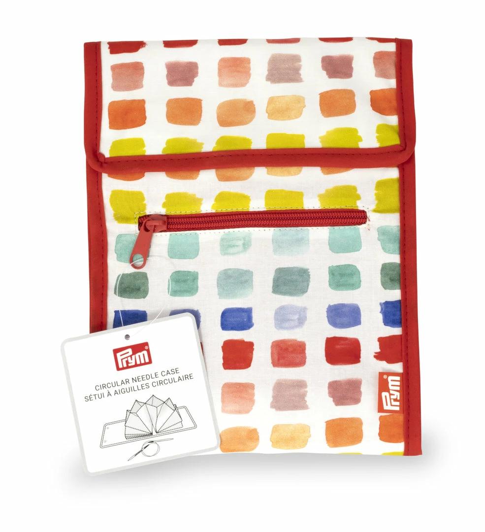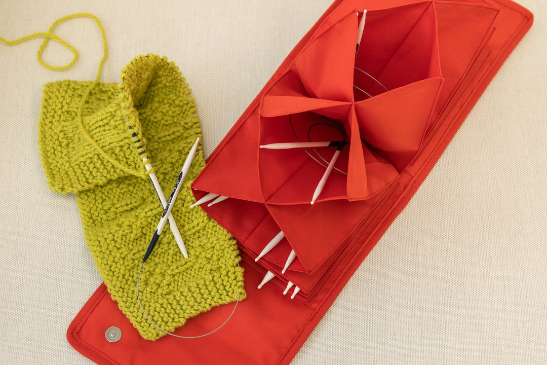Ingenious fan pocket design holds circular needles securely and avoids tangles. Holds 10+ needles. Magnetic closure keeps needles in place and allows case to expand as needed. Exterior zippered pocket is perfect for storing small tools and accessories.