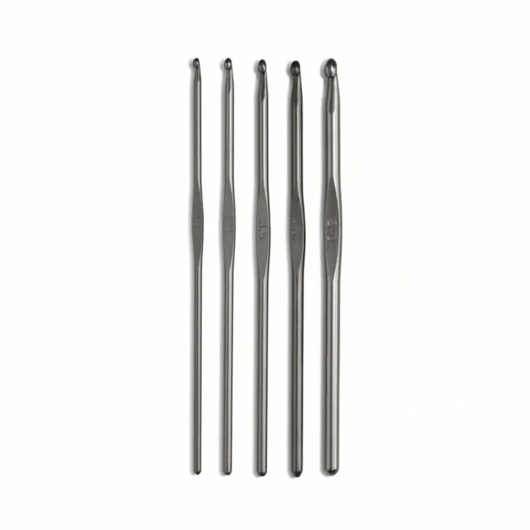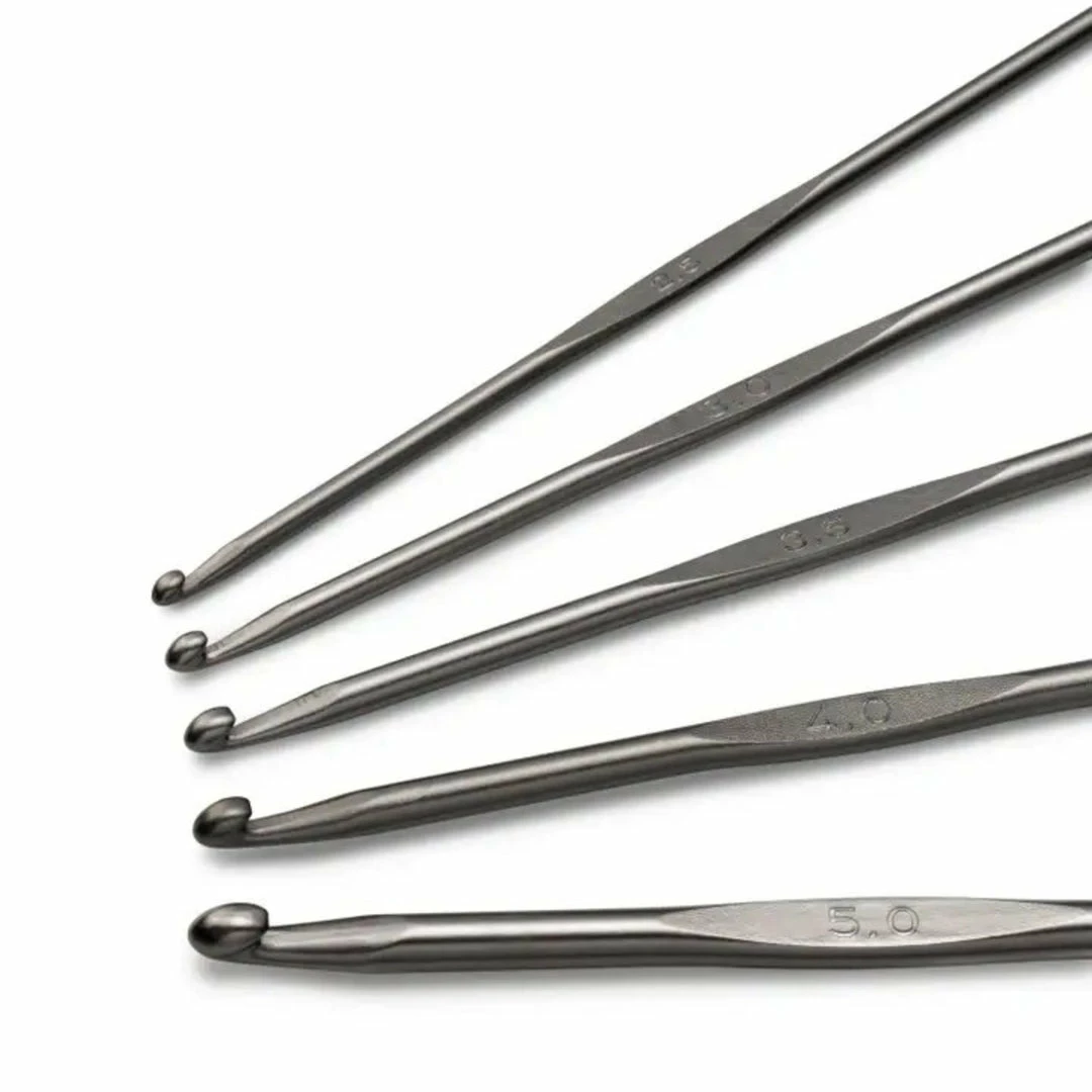 Crochet with the modern look! These sets of crochet hooks for wool each contain five crochet hooks in the new trendy colours new gold or gunmetal. These two attractive colours are available only in these sets! And of course, they come in popular gauges from 2.50 mm to 5.00 mm, so that you can start your next crochet project straight away. The guide surface on the shaft ensures that the hook does not slip in your hand and reliably lets you crochet with ease and precision. Thanks to the very smooth surface and the perfect shape of the hook, the yarn is guided evenly; in this way, this wonderfully light, aluminium crochet hook guarantees an even stitch structure. The white background of the practical, durable, plastic storage bag provides a wonderful contrast to the gleaming crochet hooks. The set also makes the perfect gift!