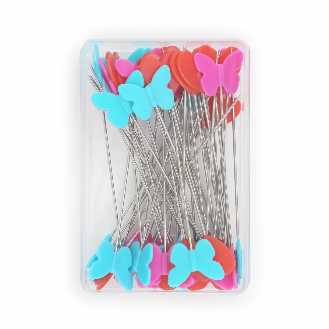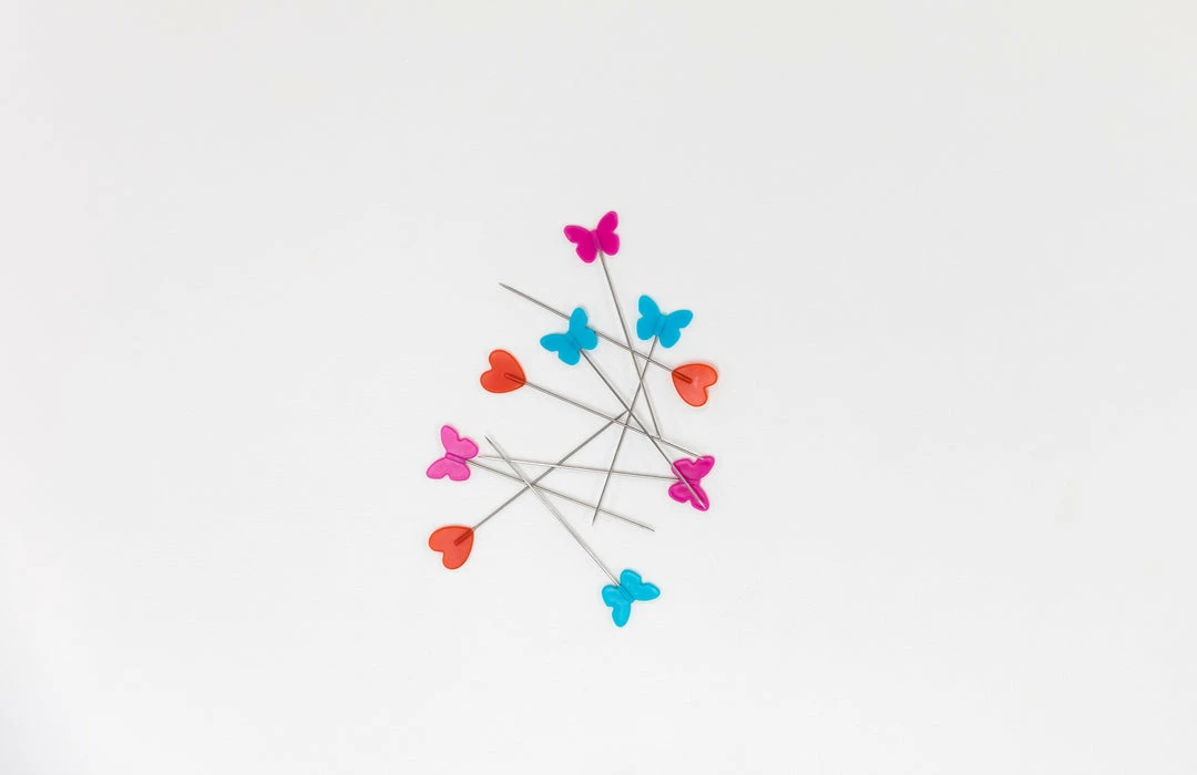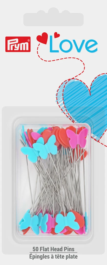 Prym Love Flat Head Pins are perfect for sewing and quilting. The flat heads are easy to handle while stitching. Red hearts and turquoise and pink butterflies add an element of fun to your sewing time.