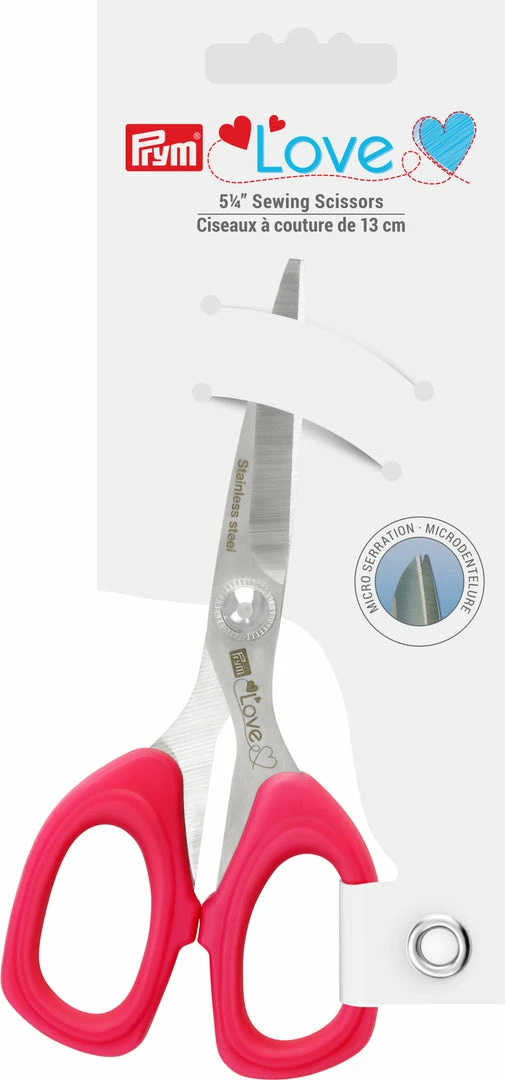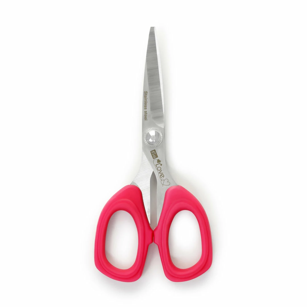 Prym Love 5-1/4″ Scissors have micro serrated blades for extra grip on smooth fabrics. Their soft handles make these scissors very comfortable for long use. Constructed from rustproof stainless steel.