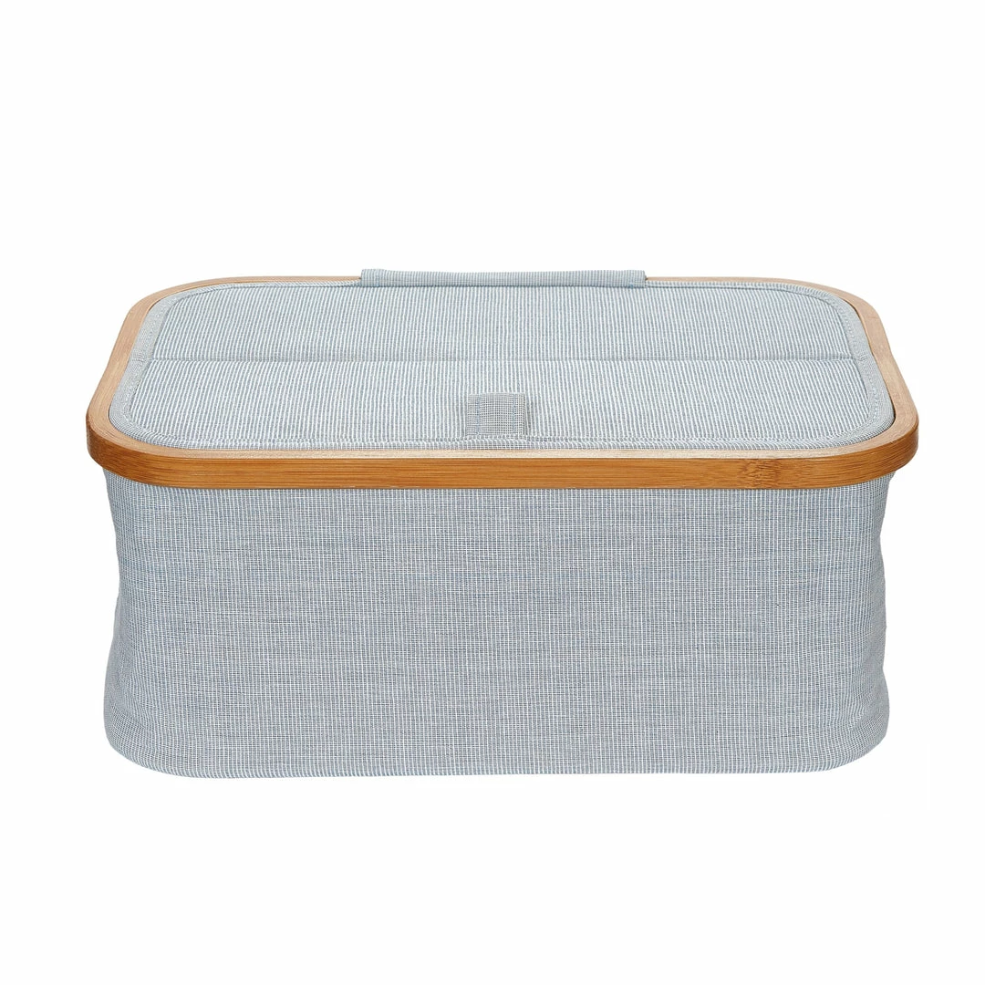 Fold & Store Box folds down for storage or can be built to hold sewing, quilting, and needlecraft projects. Its reinforced base allows it to be stacked for more storage options. The lid is secured and can be opened halfway for quick access to stored items or opens completely for full access. Simply build box by pushing attached internal bars under the bamboo frame and securing with hook and loop tabs. Use side openings to carry or grab box.