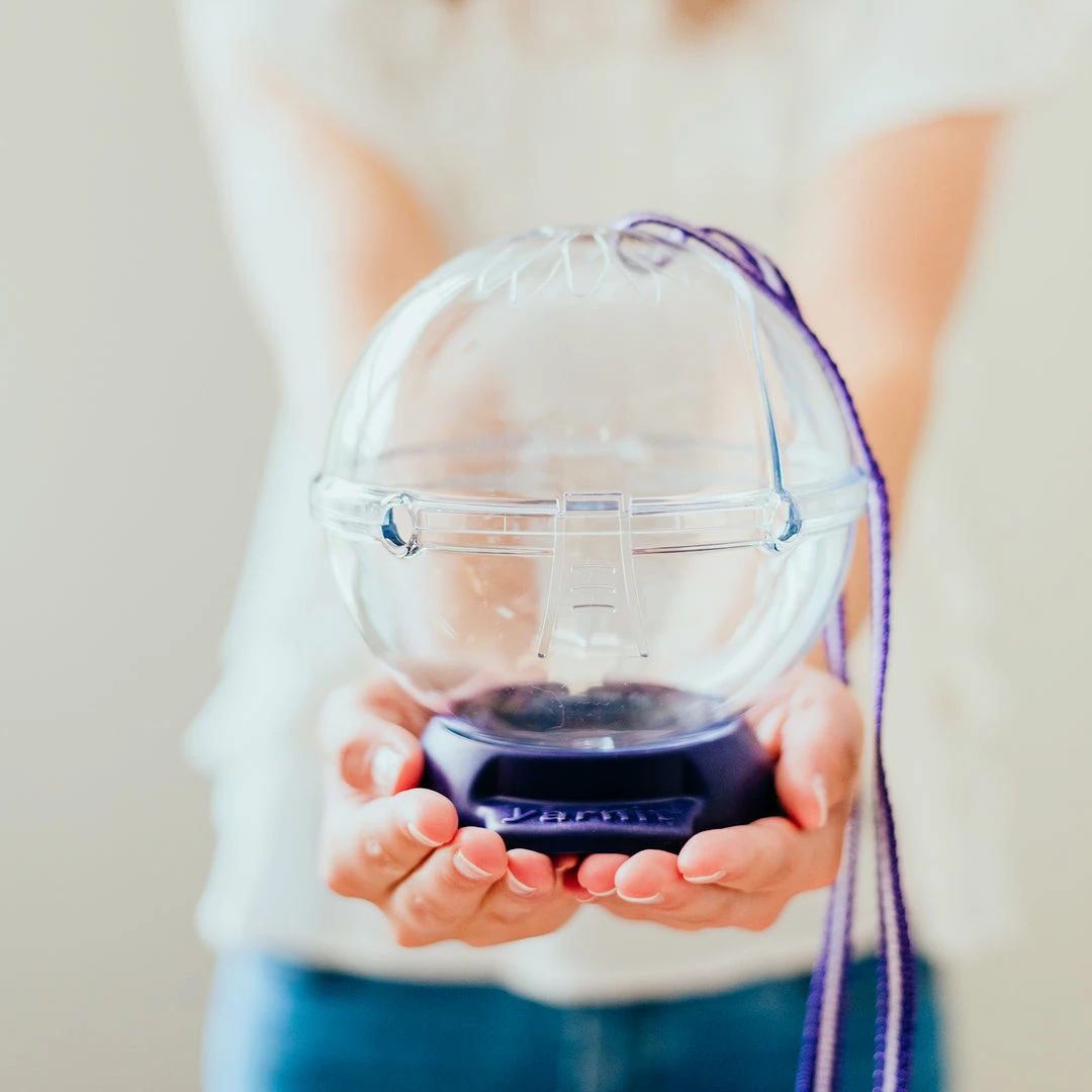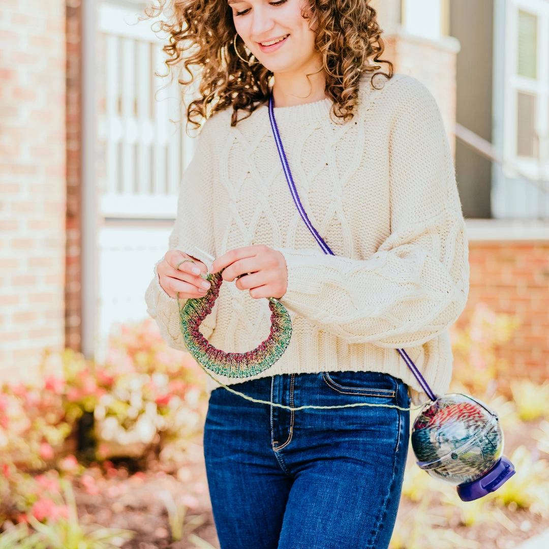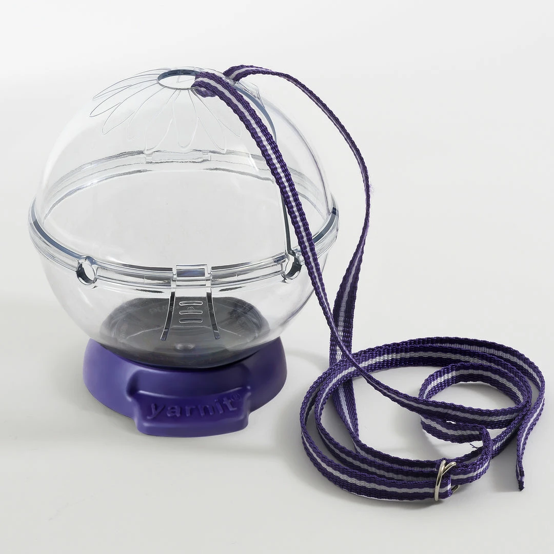 The Prym Yarnit is a durable clear globe that provides a protective home for your yarn and accessories. Yarns can be switched mid-project with hinged lid and open yarn channels. The shoulder strap makes the Yarnit easy to use on the go. Non-slip base removes to store all of your yarn accessories. On the go or at home, the Yarnit is perfect for all your fiber art projects.
