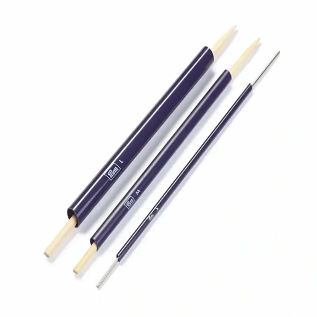 This practical Prym turning set makes the turning of fabric tunnels such as straps or belt loops easy, making it an extremely useful sewing accessory. From a small belt loop to a broad bag handle, any self made fabric tunnel can be easily turned. The fabric tunnel is first sewn on only one side and then placed over the plum blue plastic tube. With the enclosed wooden rod, the fabric can now be pushed through the tube on the stitched side and be automatically turned. In the set there are three sizes: S for tunnel widths from 9.5 mm to 16 mm, M for tunnel widths from 19 mm to 25 mm and L for tunnel widths greater than 25 mm.